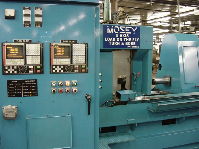 Mosey's patented proprietary 5-axis CNC lathe enables simultaneous turning and boring through the use of "virtual chucking" between part faces.